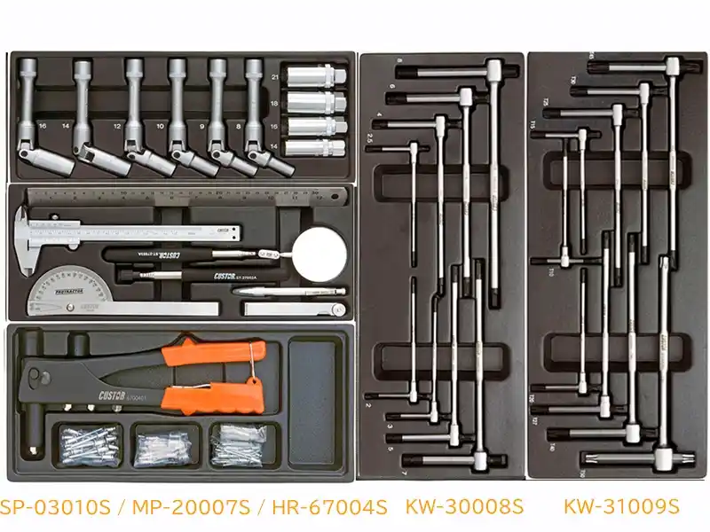 | * 1 pc centimeters ruler x 300mmL * 1 pc vernier caliper x 150mmL * 1pc rivet mode protractor * 1pc scriber * 1pc thickness gauge (0.05~1.00mm) * 1 pc magnetic pick-up tool (cap. 1.5 kgs) * 1 pc inspection mirror tool (57mm dia.) |