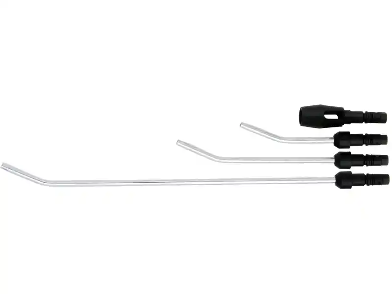 * 4 interchangeable nozzles with steel extensions and adjustable angles for confined spaces.
