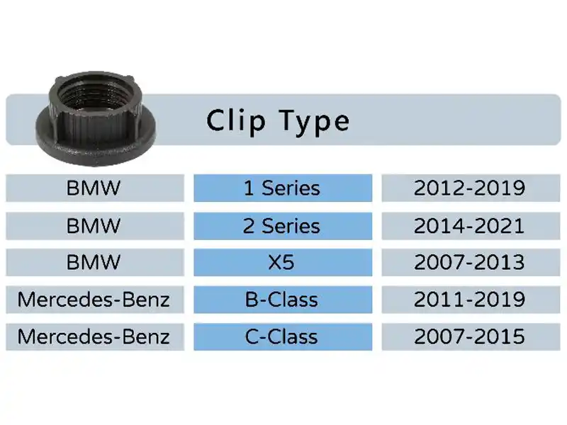 * Mercedes: C-class, CLA-class, CL-class, CLK-class, CLS-class, E-class, G-class, GLA-class, GLC-class, GL-class, M-class, GLE-class, GLK-class, GT-4-door, R-class, S-class, SL-class, SLK-class, SLS AMG, Vaneo, Vito, Sprinter