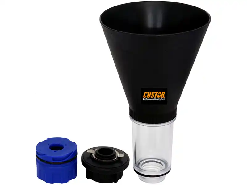 * funnel can be directly connected to oil filler necks, eliminating unsafe oil spills