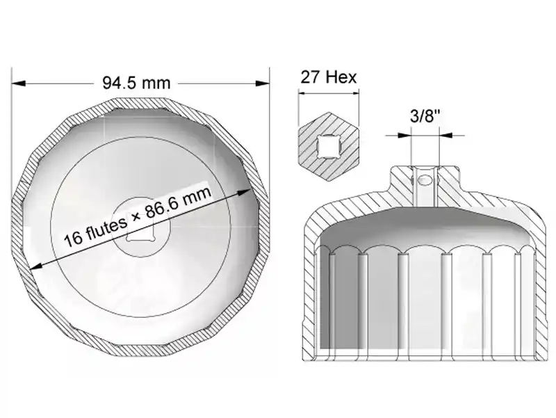 * 16 flutes x 86.6 mm x 3/8" dr x 76 mm (h)